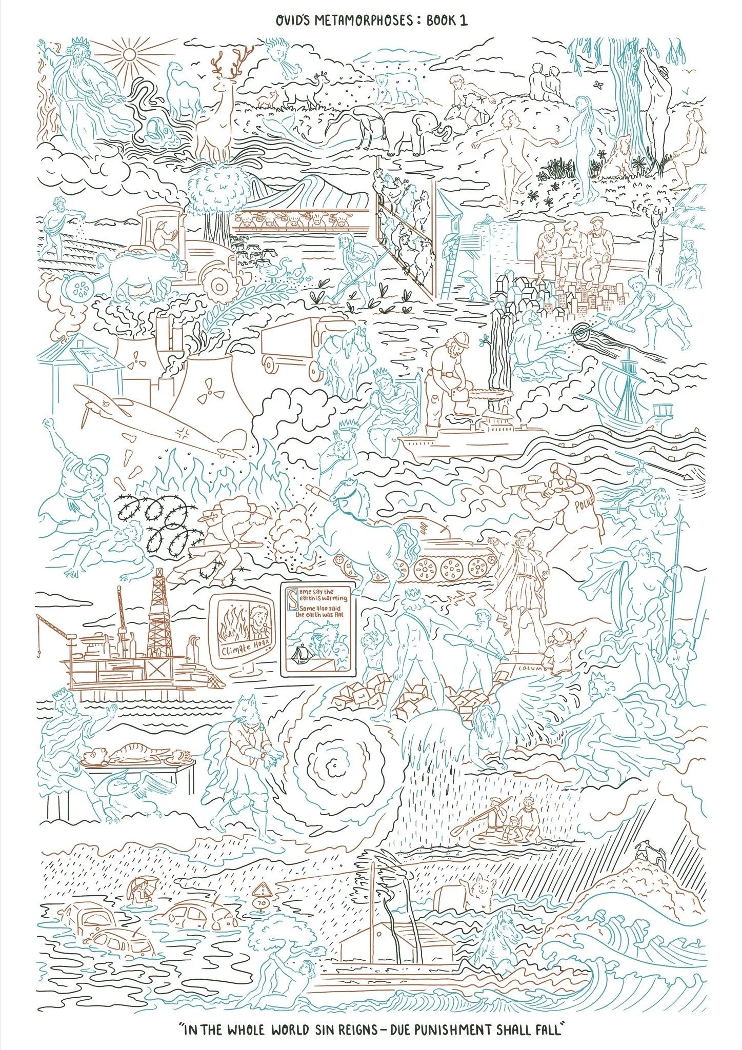 This is a poster design that compares the first book of Ovid’s Metamorphoses with contemporary environmental issues, from ‘Creation’ to ‘The Flood’